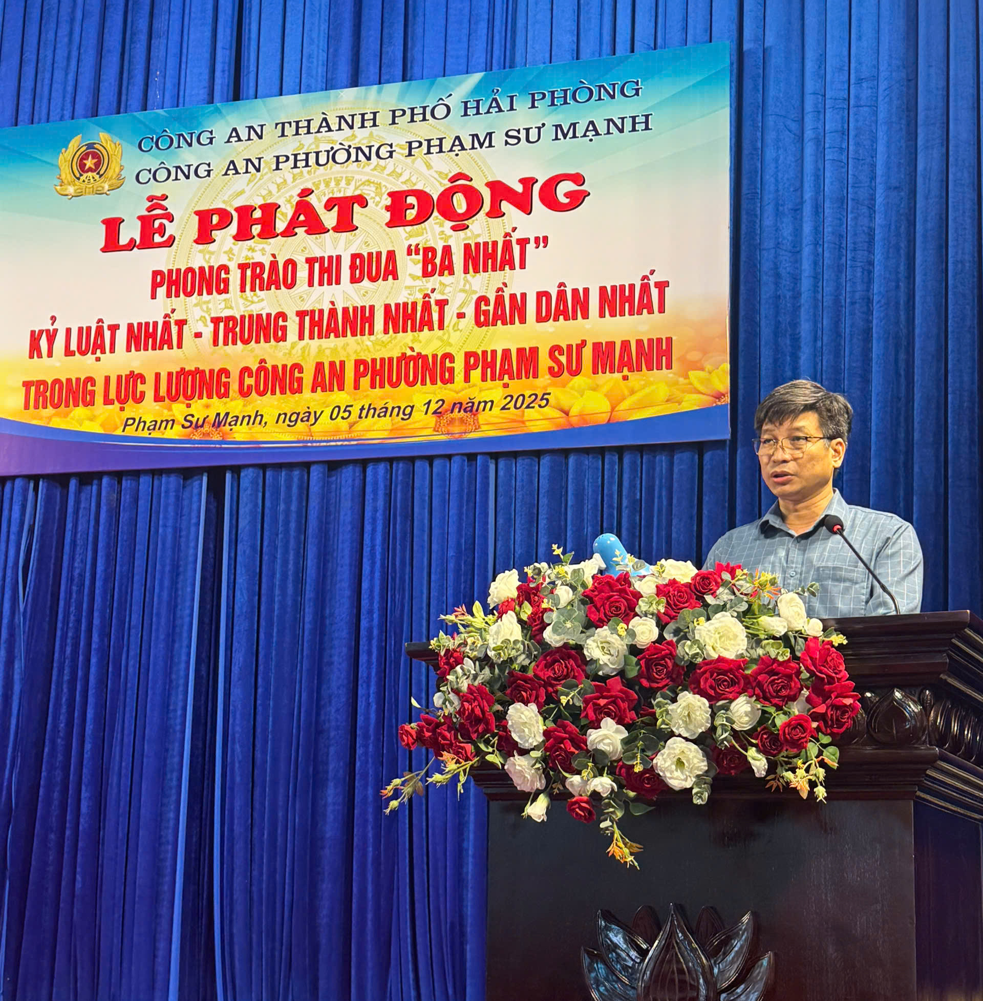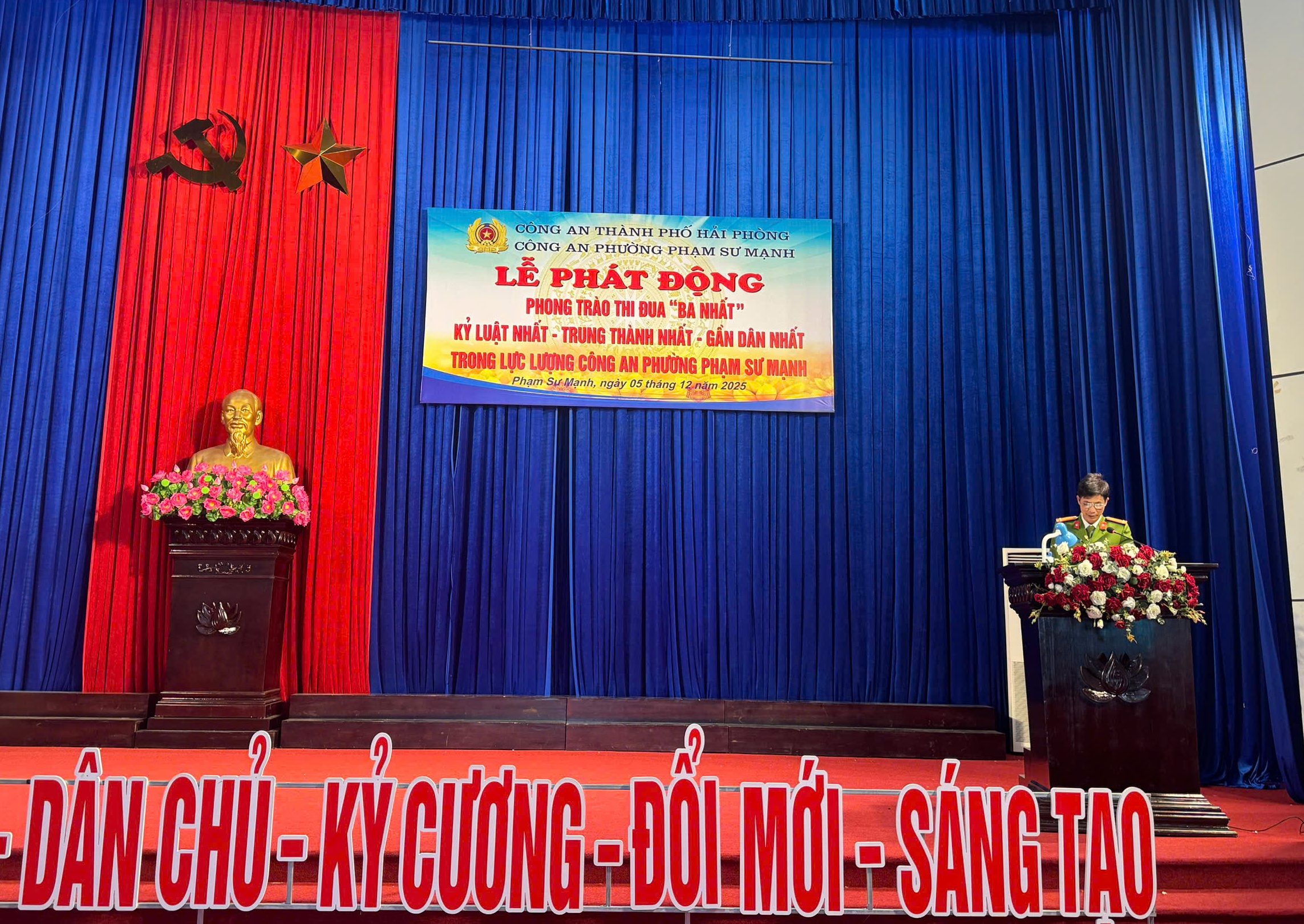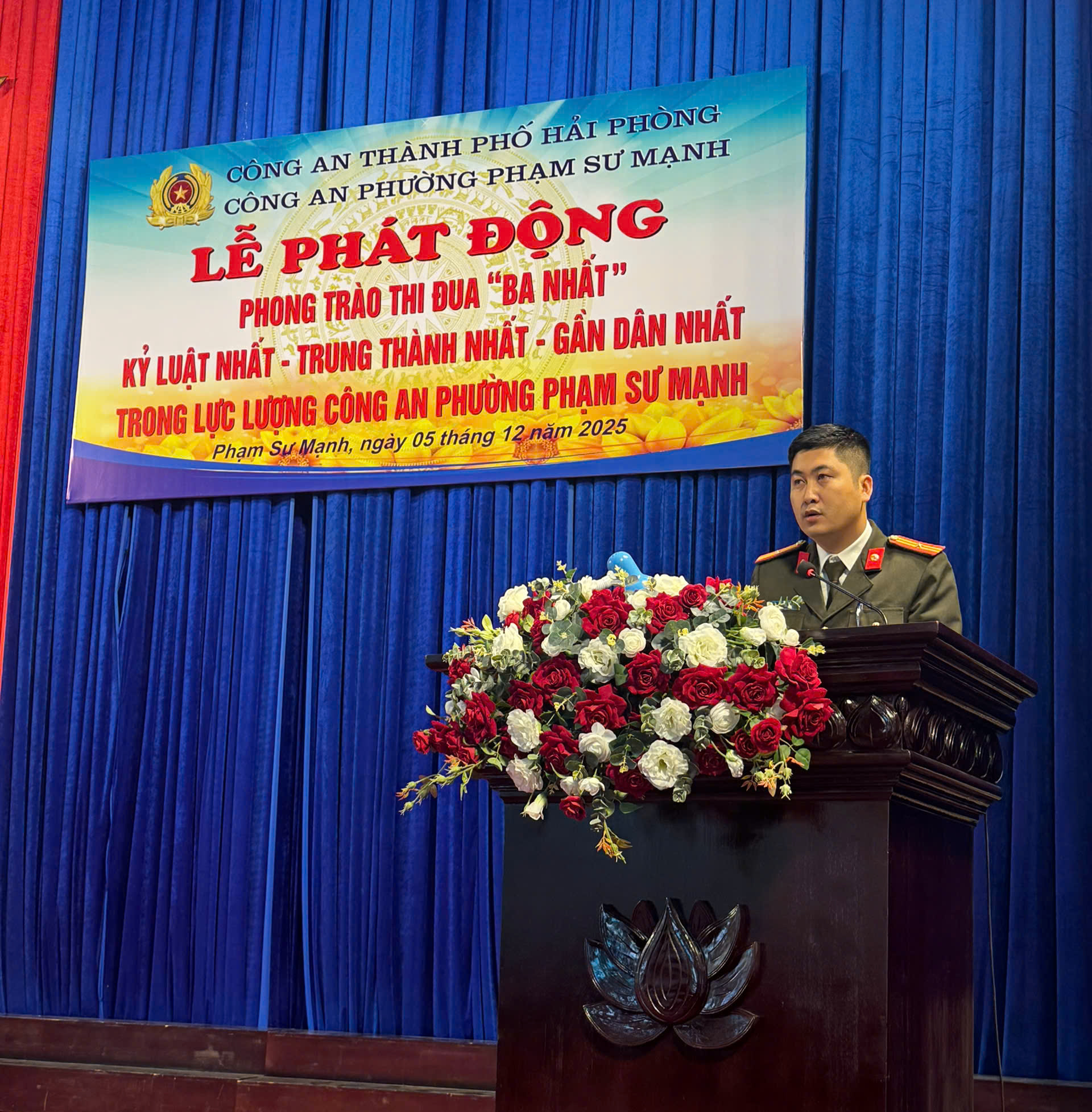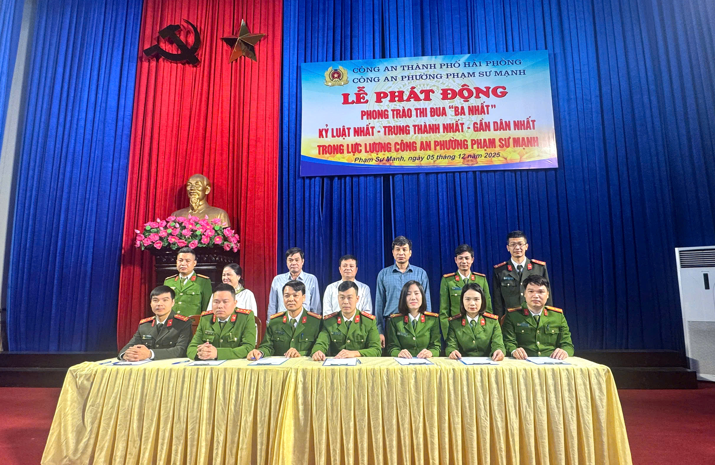 Sáng ngày 05/12/2025, thực hiện Kế hoạch số 4715/KH-CATP-PX03 ngày 31/10/2025 của Công an TP Hải Phòng về phát động phong trào thi đua “Ba nhất”, Công an phường Phạm Sư Mạnh tổ chức Lễ phát động phong trào thi đua giai đoạn 2025 - 2030 với tinh thần kỷ cương, trách nhiệm, hướng mạnh về cơ sở. Tham dự buổi lễ có đồng chí Nguyễn Trọng Thưởng - Phó Chủ tịch UBND phường cùng đại diện các ban ngành, tổ dân phố, tổ ANTT và toàn thể cán bộ, chiến sĩ đơn vị.