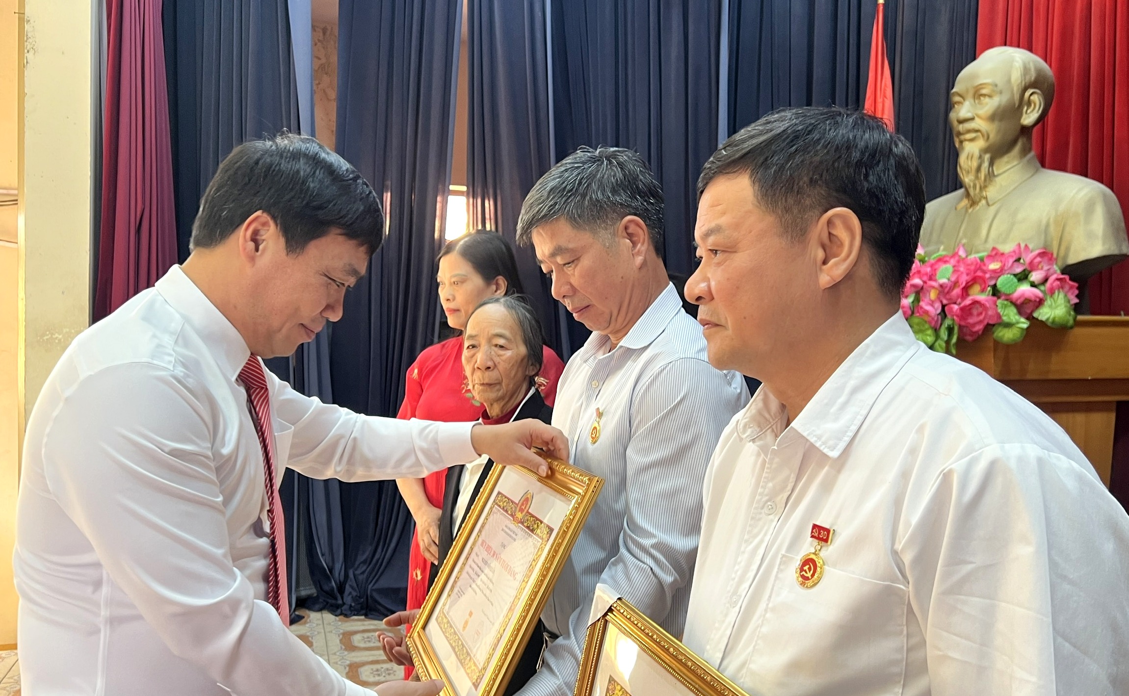 Đồng chí Nguyễn Văn Hùng, Bí thư Đảng ủy, Chủ tịch HĐND phường Phạm Sư Mạnh trao Huy hiệu Đảng tặng các đảng viên lão thành