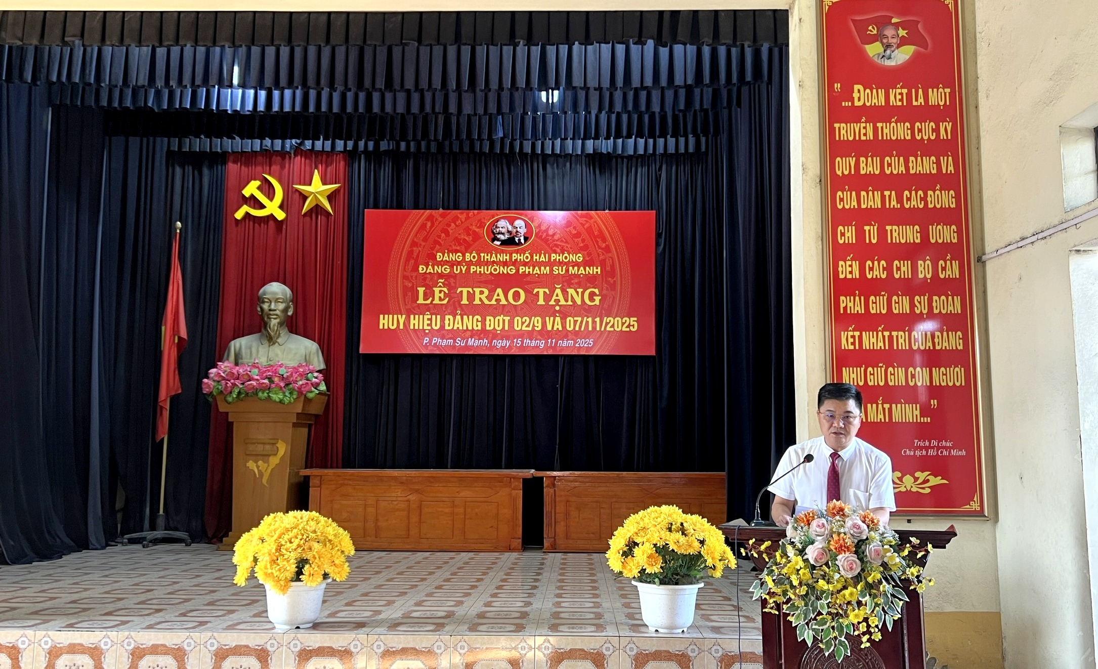 Đồng chí Lại Văn Lương, Phó Bí thư Đảng ủy, Chủ tịch UBND phường trao Huy hiệu Đảng tặng các đảng viên lão thànhPhát biểu tại buổi lễ, đồng chí Nguyễn Đình Chuyến ghi nhận và đánh giá cao những đóng góp của các đảng viên lão thành - những “ngọn đuốc sáng” góp phần giữ gìn bản lĩnh, nền tảng và truyền thống đáng tự hào của Đảng bộ phường, nhất là trong giai đoạn phường Phạm Sư Mạnh thực hiện mô hình chính quyền đô thị và nhiệm vụ sau sáp nhập.