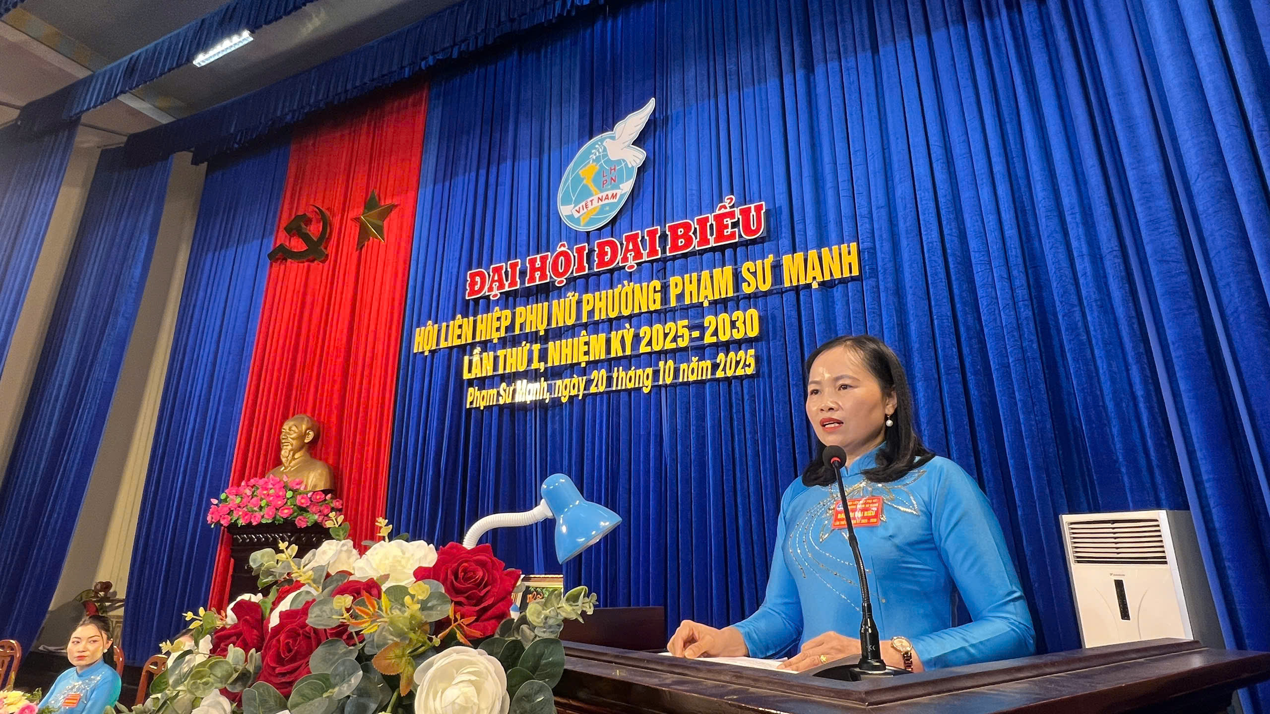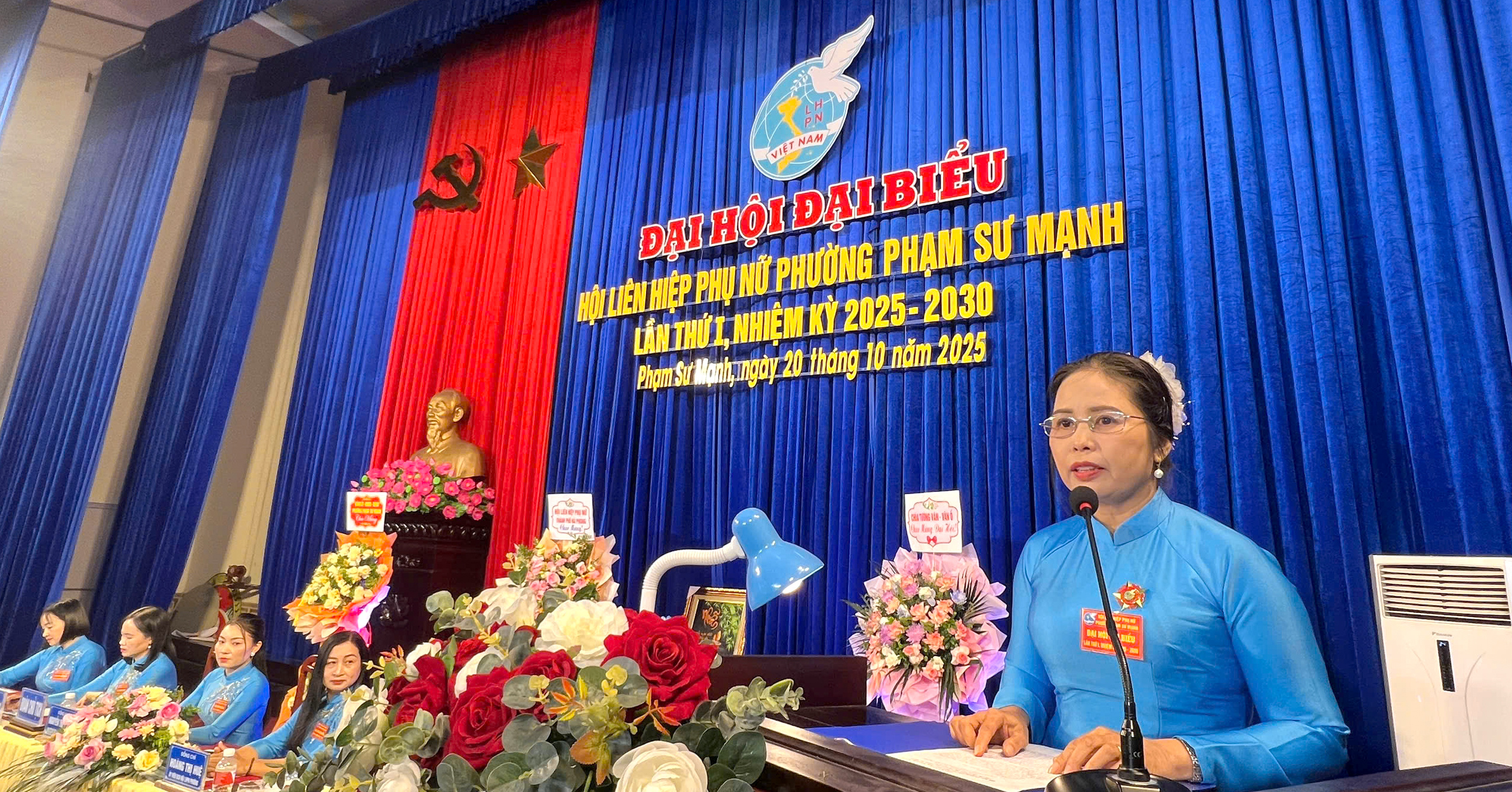 Đồng chí Nguyễn Thị Hương, Chi hội trưởng Chi hội phụ nữ TDP Hiệp Thượng trình bày tham luận tại Đại hộiBước vào nhiệm kỳ mới 2025-2030, Đại hội đề ra mục tiêu: Đoàn kết – Sáng tạo – Phát triển bền vững, xây dựng tổ chức Hội vững mạnh, hoạt động hiệu quả, thích ứng linh hoạt với bối cảnh mới; phát huy vai trò của phụ nữ trong tham gia xây dựng Đảng, chính quyền trong sạch, vững mạnh; góp phần xây dựng phường Phạm Sư Mạnh phát triển nhanh, bền vững, văn minh và hiện đại.