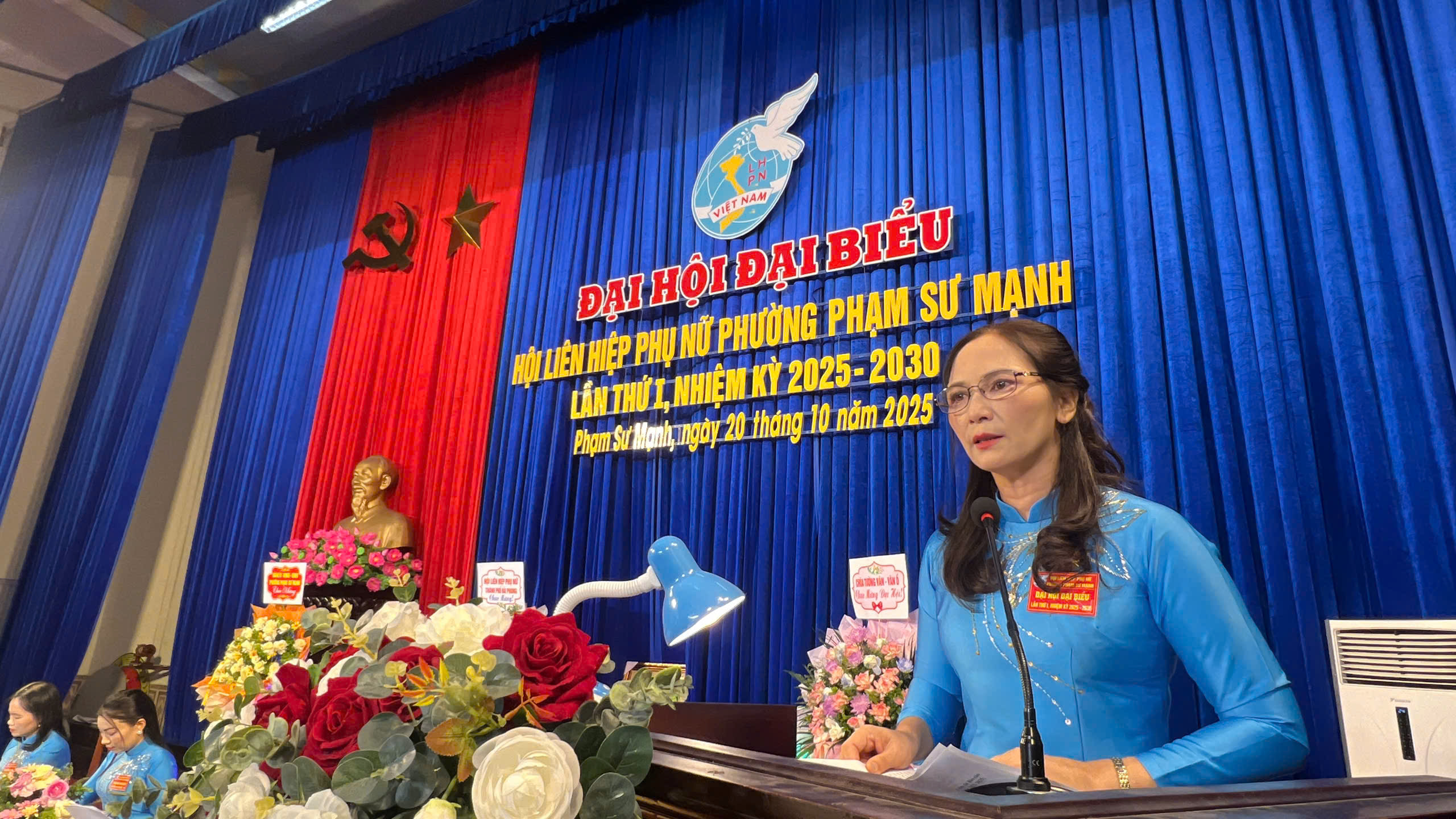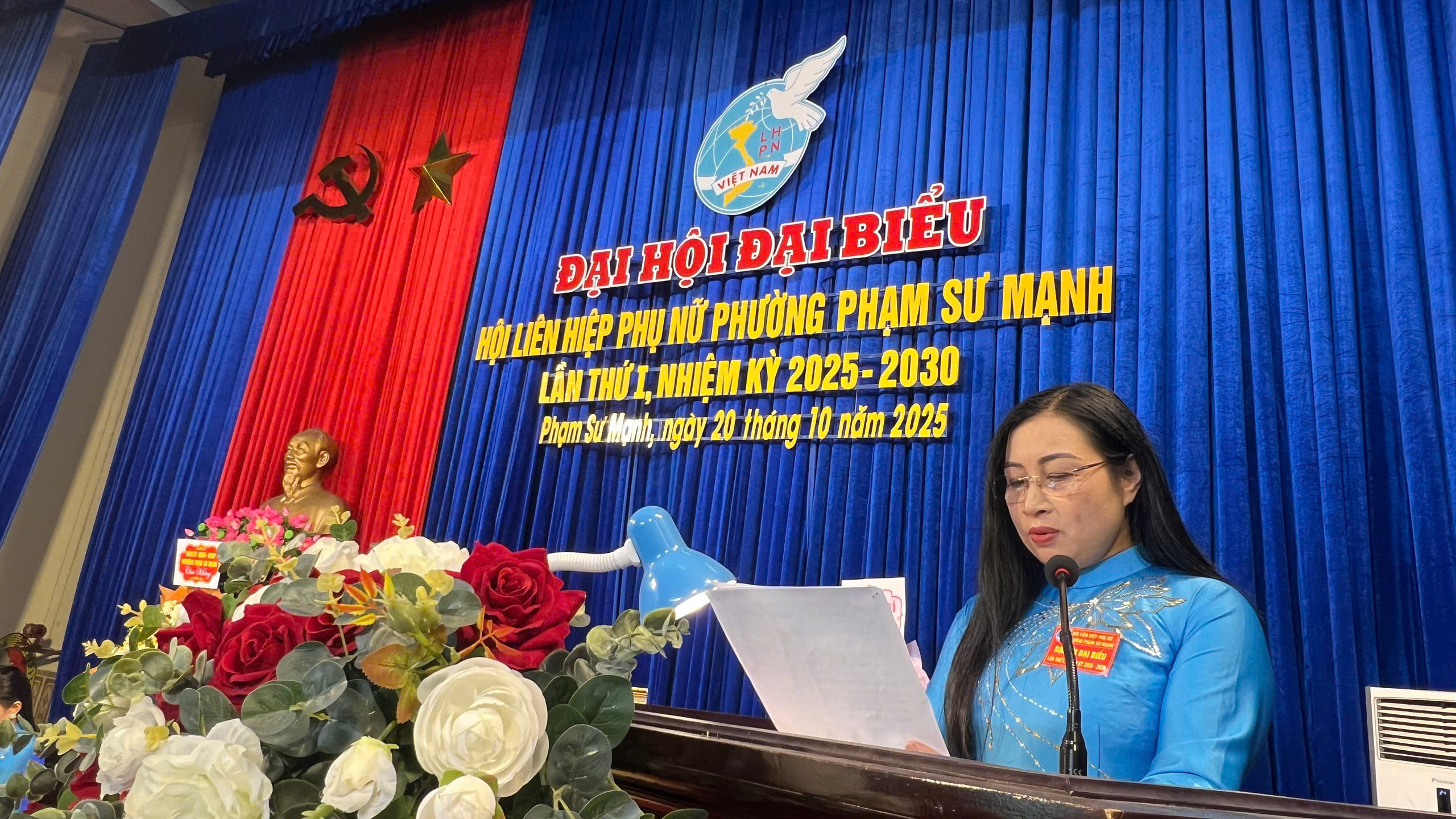 Đồng chí Hoàng Thị Huệ, Ủy viên BCH Hội LHPN phường trình bày báo cáo tại Đại hộiTrong nhiệm kỳ 2021-2025, Hội Liên hiệp Phụ nữ phường đã phát động và triển khai hiệu quả phong trào thi đua “Xây dựng người phụ nữ Phạm Sư Mạnh tự tin, nhân ái, năng động, sáng tạo, có khát vọng phát triển” gắn với việc học tập và làm theo tư tưởng, đạo đức, phong cách Hồ Chí Minh.