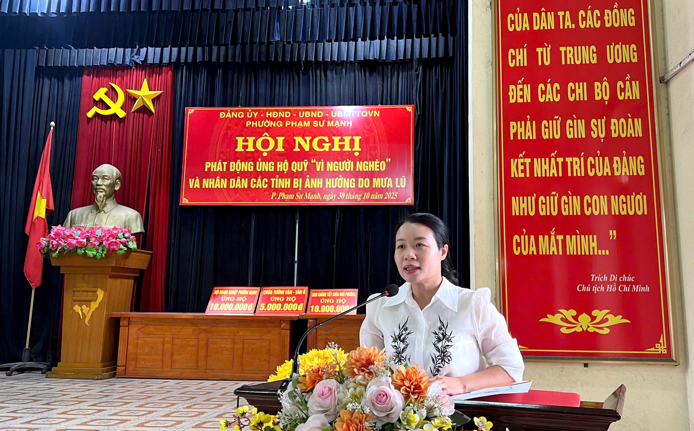 Đồng chí Vũ Thị Bích Quỳnh, Phó Bí thư thường trực Đảng ủy phát biểu tại Hội nghịTại chương trình, tinh thần tương thân tương ái, “lá lành đùm lá rách” được lan tỏa sâu rộng. Hội Doanh nghiệp phường Phạm Sư Mạnh đã trao tặng 10 triệu đồng ủng hộ; Ban Khánh tiết chùa Ngũ Phương ủng hộ 10 triệu đồng; chùa Tường Vân – Văn Ổ ủng hộ 5 triệu đồng; cùng nhiều tập thể, cá nhân, cán bộ, công chức phường nhiệt tình hưởng ứng đóng góp.