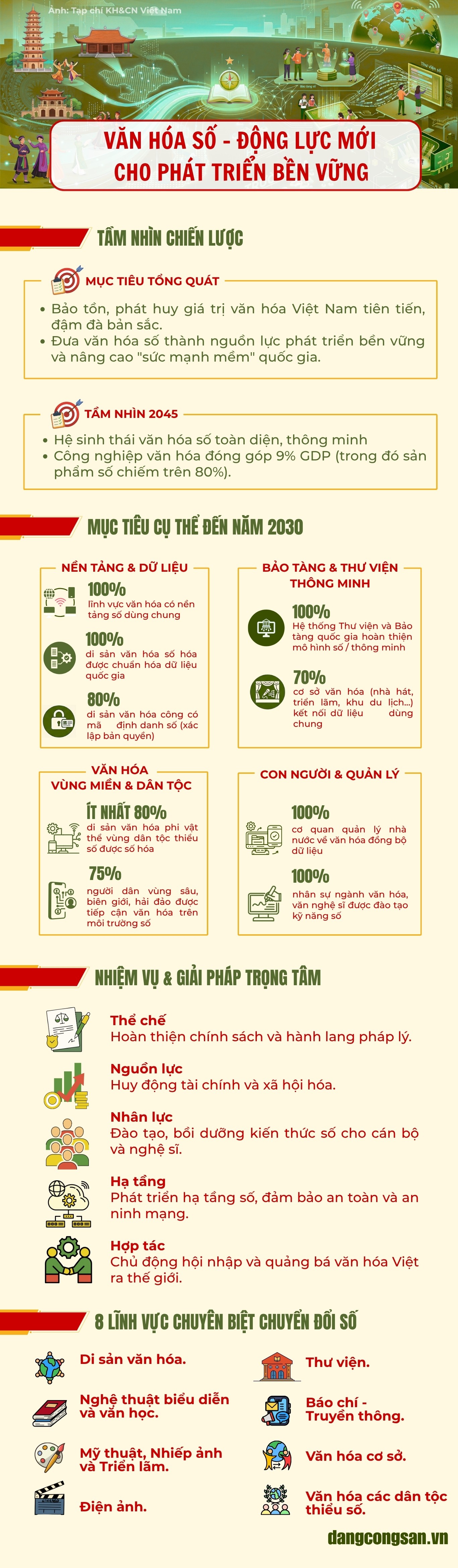 Đề án "Chuyển đổi số trong lĩnh vực văn hóa đến năm 2030, tầm nhìn đến năm 2045" đặt ra mục tiêu hiện đại hóa toàn diện hệ sinh thái văn hóa số quốc gia nhằm bảo tồn và phát huy giá trị văn hóa Việt Nam tiên tiến, đậm đà bản sắc dân tộc, giàu sáng tạo và chủ động hội nhập quốc tế.
